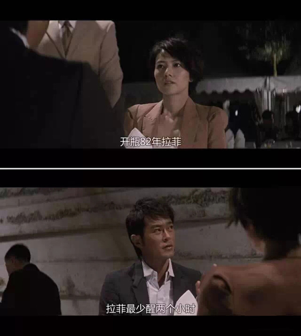 杜琪峰的另一部戲《單身男女》,上市公司高管要跟女神表白,便將其帶到高級(jí)餐廳,也是點(diǎn)了瓶拉菲1982,還指定要醒兩小時(shí)。就這樣,82年的拉菲大火特火。