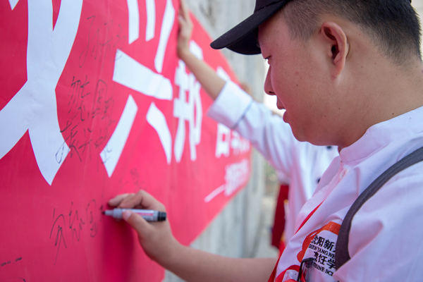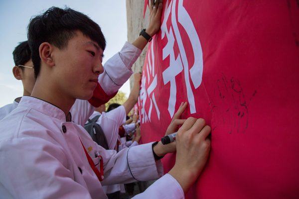 參觀完博物館后同學(xué)們在“勿忘國恥 我輩自強(qiáng)”的條幅上簽字